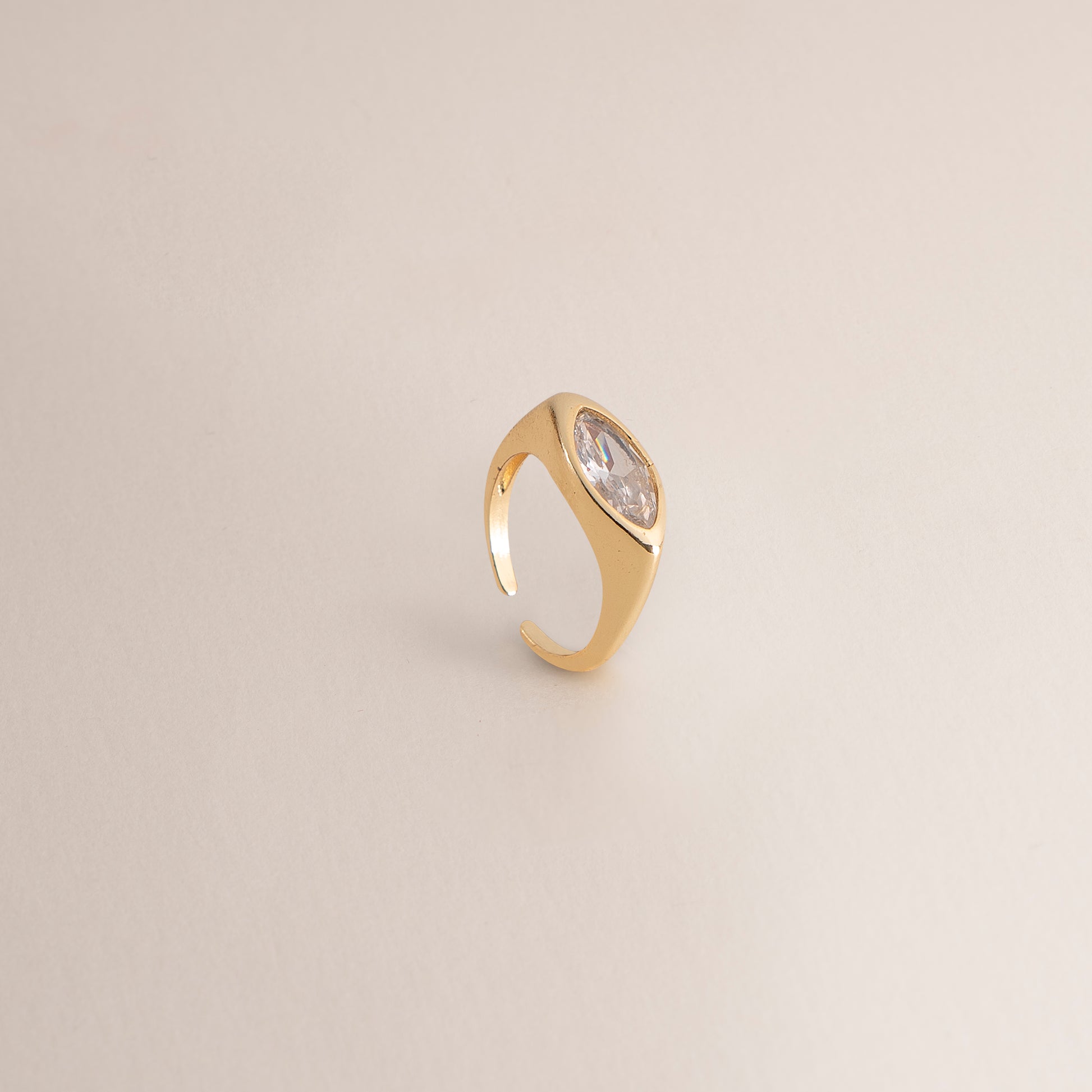 Simple, stunning, and endlessly wearable, the Ava Ring is understated luxury at its finest. A sleek gold tone signet-style band cradles a single marquise-cut stone, its brilliant facets catching the light with every movement. The open adjustable design makes it as effortless to wear as it is to love. Dress it up, stack it, or let it shine on its own.