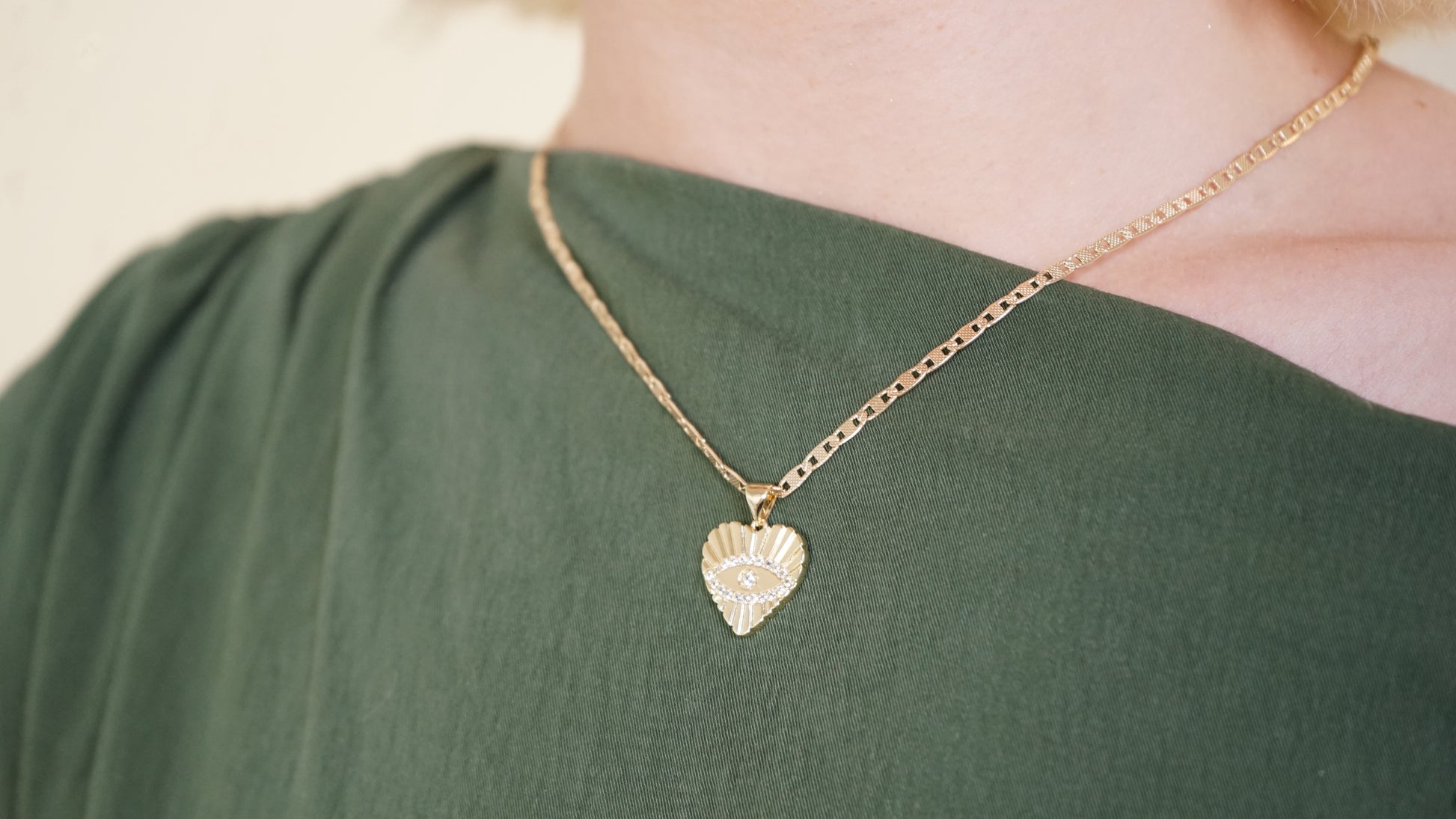 Suspended from a delicate gold chain, the intricately detailed heart charm captivates with its refined artistry and polished finish. It's timeless appeal ensures that it remains a cherished keepsake, embodying elegance with every wear.